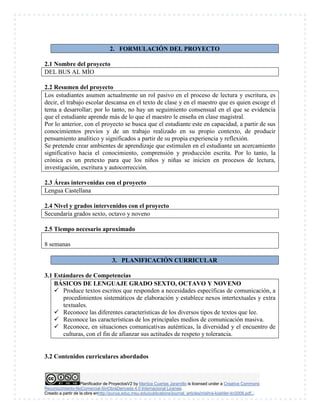 Este documento presenta un proyecto educativo sobre la elaboración de crónicas literarias por parte de estudiantes de sexto, octavo y noveno grado. El proyecto busca que los estudiantes desarrollen habilidades de lectura, escritura e investigación a través de realizar un trabajo de campo y producir una crónica y un video sobre el sistema de transporte público de Cali. El documento describe los objetivos del proyecto, las áreas y contenidos curriculares abordados, la metodología que incluye el uso de herram
