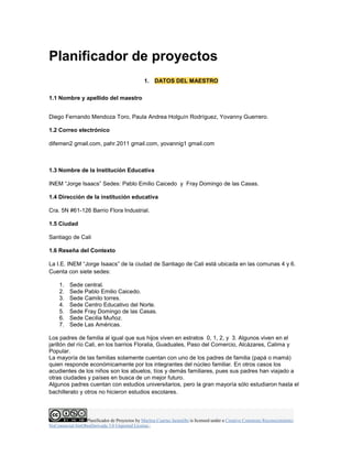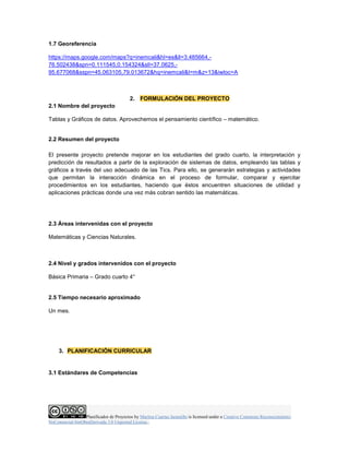 Este documento presenta un planificador de proyectos para el área de matemáticas en grado cuarto. El proyecto busca mejorar la interpretación y predicción de resultados a partir de tablas y gráficos utilizando las TIC. El proyecto aborda contenidos como estudio estadístico, tablas y gráficas de datos e involucra áreas como matemáticas y ciencias naturales durante un mes. El proyecto empleará estrategias como la representación e interpretación de datos y el desarrollo de habilidades del siglo XX