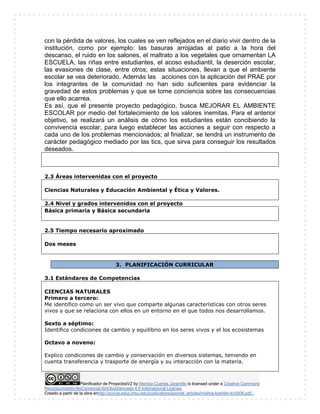 Este documento presenta un proyecto pedagógico diseñado para mejorar el ambiente escolar y fortalecer los valores en la Institución Educativa INEM - Jorge Isaacs en Cali, Colombia. El proyecto busca abordar problemas como la contaminación ambiental, el ruido y la pérdida de valores a través de actividades sobre clasificación de residuos, control del ruido y apropiación de valores institucionales usando herramientas TIC. El proyecto involucra a estudiantes de primaria y secundaria durante dos meses median