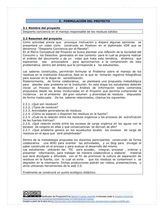 Este documento presenta la planificación de un proyecto educativo que busca crear conciencia sobre el manejo responsable de los residuos sólidos en una institución educativa. El proyecto involucra a estudiantes de grado 11 y aborda contenidos de química, geociencias, inglés y lengua castellana. La metodología incluye actividades de investigación, uso de TIC, y la construcción de un punto ecológico didáctico. El objetivo final es promover la separación de residuos en la fuente para evitar su