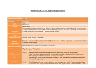 Este documento presenta la planificación de una clase digital sobre gráficos. Incluye elementos curriculares, objetivos, contenidos, actividades, evaluaciones y estrategias pedagógicas. Los estudiantes aprenderán a construir tablas de datos y gráficos de barras usando herramientas tecnológicas. Realizarán actividades como recopilar datos de Internet y crear una tabla y gráfico. El profesor guiará las explicaciones y evaluará el trabajo de los estudiantes.