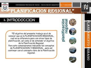 Este documento define y explica la planificación regional. Indica que la planificación regional busca proyectar un futuro deseado para una región determinada, ordenando las actividades humanas y el desarrollo de acuerdo a las necesidades y recursos de esa región. Explica que la planificación regional considera aspectos físicos, económicos y sociales de manera continua e integral. También describe algunos organismos de planificación regional en Venezuela y los objetivos generales de equilibrar el desarrollo entre regiones y promover el crecimiento económico y