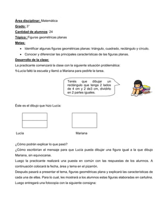 El documento describe una lección de matemáticas para estudiantes de 3er grado sobre figuras geométricas planas. La clase consiste en identificar triángulos, cuadrados, rectángulos y círculos, luego completar ejercicios de identificación y dibujo de figuras usando el programa GeoGebra. La evaluación se realiza durante el desarrollo de las actividades.