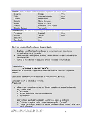 El plan de unidad trata sobre la comunicación. Se explican e identifican los elementos de la comunicación en situaciones del contexto del estudiante y cómo utilizar diferentes formas de comunicación para transmitir un mensaje. La unidad cubre materias como español e incluye actividades como preguntas de selección múltiple sobre lecturas relacionadas a la comunicación y los avances tecnológicos.