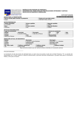Este documento contiene una solicitud de pasaporte venezolano que requiere datos personales como nombre, fecha de nacimiento, dirección y firma del solicitante. La solicitud debe ser tramitada en una oficina específica en una fecha determinada y el costo del pasaporte es de 3 unidades tributarias.