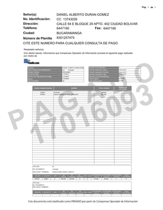 Este documento es un recibo de pago de aportes de salud, pensión y caja de compensación familiar para Daniel Alberto Durán Gómez por el mes de enero de 2012. Se pagaron $154,200 a dos administradoras de fondos de pensiones y de riesgos profesionales. El pago se realizó a través del banco Occidente el 18 de enero de 2012.