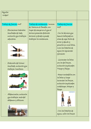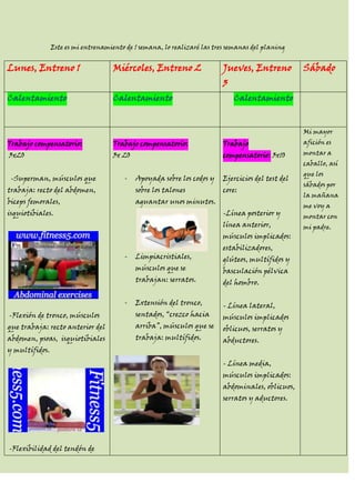 Este documento presenta el plan de entrenamiento de 1 semana que la persona realizará durante 3 semanas. Cada día de entrenamiento incluye calentamiento, trabajo compensatorio enfocado en diferentes grupos musculares, trabajo de fuerza o resistencia, y estiramientos finales. Los ejercicios trabajan músculos como cuádriceps, glúteos y core. Los sábados incluyen una carrera o montar a caballo.