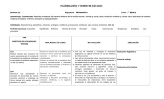 El documento detalla la planificación del primer semestre de 2023 para la asignatura de matemáticas en 7° básico, enfocándose en aprendizajes transversales y habilidades como la resolución reflexiva de problemas. Establece objetivos de aprendizaje y metodologías que incluyen actividades individuales y colaborativas, así como evaluaciones diagnósticas y formativas para fortalecer la comprensión de conceptos como la adición, sustracción, multiplicación y división de números, fracciones y porcentajes. También fomenta el uso de lenguaje algebraico y la identificación de relaciones proporcionales en situaciones cotidianas.