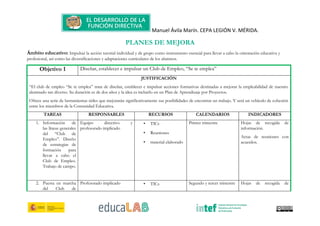 Este documento presenta el plan de mejora del CEPA Legión V. Mérida. Propone 6 objetivos principales: 1) Crear un Club de Empleo para mejorar la empleabilidad del alumnado, 2) Elaborar material didáctico específico, 3) Integrar la evaluación como instrumento clave, 4) Establecer vínculos con instituciones locales, 5) Mejorar la imagen del centro, y 6) Fomentar las competencias digitales de alumnos y profesores. Cada objetivo describe las tareas, responsables, recursos, cal
