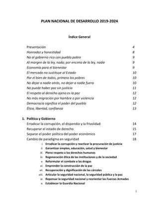 Este documento presenta el Plan Nacional de Desarrollo 2019-2024 de México. Resume la historia del desarrollo económico en México desde los años 1930, contrastando el modelo de desarrollo estabilizador con el modelo neoliberal implantado en los años 1980. Argumenta que el modelo neoliberal fracasó al no lograr el crecimiento económico prometido ni reducir la desigualdad y pobreza, y en su lugar agudizó estos problemas. El Plan Nacional de Desarrollo busca construir un nuevo modelo de desarrollo que promue