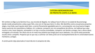 Olga Lucia Sánchez Cruz vive en Bucaramanga con su hijo de 11 años. Se describe a sí misma como una persona alegre y proactiva que le gusta verse bien. Sus hábitos incluyen ir a trabajar, compartir con amigos y familia, leer, y estudiar. Actualmente está enfocada en completar sus estudios con éxito con el apoyo de su universidad, tutores y familia.