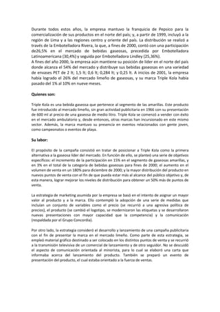 La empresa Bebidas La Concordia S.A. decidió relanzar su producto Triple Kola en el mercado limeño en el 2000. Su estrategia se basó en mejorar la calidad, el sabor y el precio de Triple Kola para posicionarla como una alternativa a la líder del mercado, Inca Kola. La compañía Pepsico apoyó el relanzamiento mediante una gran campaña publicitaria protagonizada por tres reconocidas artistas peruanas.