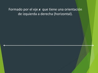 El documento describe el plano cartesiano, el cual está formado por dos ejes perpendiculares que se cruzan en un punto de origen. El eje horizontal se denomina eje x y el vertical eje y. Cualquier punto en el plano puede ubicarse mediante un par de coordenadas (x, y) que indican la distancia a cada eje desde el origen. Por ejemplo, el punto A se ubicaría en -4 unidades del eje x y 5 unidades del eje y.