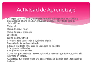 Este documento presenta instrucciones paso a paso para realizar dibujos de sombras proyectadas en dos situaciones: 1) Sombras de un plano con declive sobre el suelo y cómo se verían proyectadas sobre otro cuerpo. 2) Sombras de un plano escalonado sobre el suelo a contra luz con luz natural. Se explican 8 pasos para dibujar sombras de planos inclinados y 6 pasos para dibujar sombras de planos escalonados. El objetivo es que los estudiantes dominen el método para obtener sombras sobre planos inclinados y escal
