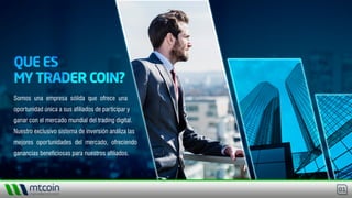 Este documento describe una empresa llamada My Trader Coin que ofrece oportunidades de inversión en el mercado de criptomonedas y trading digital. Explica qué son las criptomonedas y el trading, y describe el plan de negocio de la empresa, incluyendo diferentes niveles de membresía, bonos diarios y comisiones por referidos. El objetivo es atraer afiliados para que participen en el mercado de criptomonedas a través de esta plataforma.