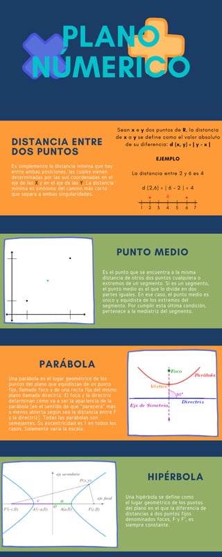 El documento presenta una explicación sobre conceptos geométricos como el punto medio, parábola, hipérbola y elipse, describiendo sus propiedades y definiciones. También se menciona la distancia entre puntos y los sistemas de ecuaciones algebraicas en matemáticas. Se incluyen ejemplos gráficos para ilustrar cada concepto expuesto.