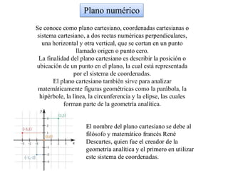 El documento explica el plano cartesiano, un sistema de coordenadas que permite ubicar puntos en un plano mediante dos rectas perpendiculares. También se aborda el uso del plano para analizar figuras geométricas como parábolas, hipérbolas, líneas y circunferencias, describiendo su origen y conceptos básicos como distancia y punto medio. Finalmente, se presentan las ecuaciones de diferentes figuras geométricas, destacando la parábola, elipses y hipérbolas.