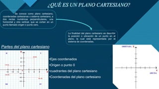 El documento explica los conceptos básicos de un plano cartesiano, incluyendo ejes coordenados, cuadrantes, y cómo usar coordenadas para describir la posición de un punto. Luego describe cómo calcular la distancia entre dos puntos usando sus coordenadas, y la ecuación para un punto medio o equidistante. Finalmente, presenta ecuaciones para líneas, círculos, parábolas, elipses e hipérbolas.