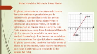 El documento describe los conceptos básicos del plano cartesiano, incluyendo sus cuatro cuadrantes y ejes. También define la distancia entre puntos y la noción de punto medio. Finalmente, introduce las ecuaciones y representaciones gráficas de circunferencias, parábolas, elipses e hipérbolas.