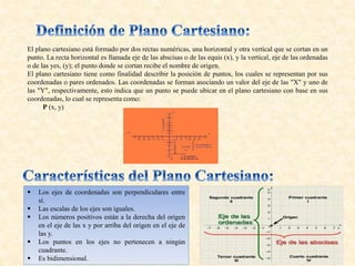 El documento explica el plano cartesiano, sus ejes, notablemente el cálculo de distancias entre puntos a través de fórmulas matemáticas y conceptos sobre puntos, segmentos y sus características. Asimismo, aborda las cónicas, como circunferencias, elipses y parábolas, incluyendo sus definiciones, ecuaciones y propiedades. Se presentan ejemplos prácticos para ilustrar los conceptos de distancia y posición en el plano.