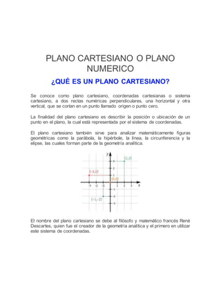 El documento explica los conceptos básicos del plano cartesiano, incluyendo sus partes (ejes, cuadrantes, origen), coordenadas y cómo representar figuras geométricas como circunferencias, parábolas, elipses e hipérboles en el plano cartesiano a través de ecuaciones. También muestra ejemplos numéricos de cómo calcular distancias entre puntos y trazar puntos dados sus coordenadas.