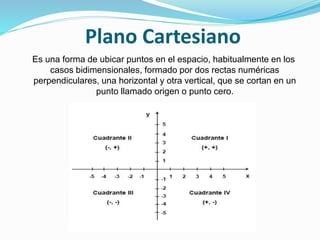 Este documento describe diferentes conceptos geométricos relacionados con el plano cartesiano. Explica que el plano cartesiano es una forma de ubicar puntos en el espacio usando dos rectas perpendiculares, y define conceptos como distancia, punto medio, ecuaciones y trazado de circunferencias. También describe las características y elementos de curvas como parábolas, elipses, hipérboles y cónicas.