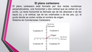 El documento describe los elementos básicos del plano cartesiano, incluyendo el eje de las abscisas, el eje de las ordenadas y el origen. Explica cómo se calcula la distancia entre dos puntos en el plano cartesiano y en la superficie terrestre. También define conceptos como el punto medio, la circunferencia, la parábola, la elipse y la hipérbola en términos de su relación con puntos fijos y distancias en el plano.