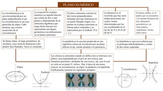 El documento describe las características básicas de varias figuras geométricas en un plano cartesiano, incluyendo círculos, elipses, parábolas e hipérbolas. Explica que un plano cartesiano consiste en dos ejes perpendiculares que se intersectan y que los puntos en el plano se representan como pares ordenados. También define la distancia entre puntos, el punto medio y cómo las ecuaciones algebraicas en el plano numérico representan figuras geométricas.