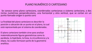 Este documento explica conceptos básicos del plano cartesiano como coordenadas cartesianas, distancia entre puntos, punto medio, ecuaciones de circunferencias, parábolas, elipses e hipérbolas. También describe los elementos geométricos de estas curvas cónicas y cómo representarlas gráficamente. Finalmente, incluye una bibliografía con enlaces a recursos adicionales sobre estos temas.