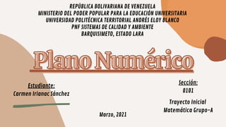 El documento habla sobre el plano numérico y algunas de sus características fundamentales como el eje de las abscisas (eje x) y el eje de las ordenadas (eje y). Explica conceptos como distancia, punto medio, ecuaciones de líneas y curvas como rectas, circunferencias, parábolas, elipses e hipérbolas. Finalmente, muestra algunas referencias bibliográficas relacionadas con estos temas.