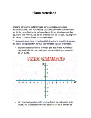 El documento presenta conceptos clave de matemáticas, incluyendo el plano cartesiano, la distancia entre puntos, punto medio, ecuaciones de la recta, y geometría de curvas como circunferencias, parábolas, elipses y hipérbolas. Se describen fórmulas y definiciones relacionadas, como la pendiente de una recta, características de una elipse y propiedades de una hipérbola. Además, se incluyen referencias bibliográficas para profundizar en cada tema.
