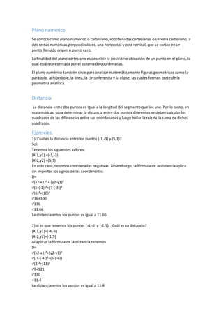 El documento describe las características fundamentales del plano numérico o cartesiano, incluyendo cómo se usa para describir la posición de puntos y analizar figuras geométricas. Luego explica cómo calcular la distancia entre puntos y determinar el punto medio entre dos puntos. Finalmente, analiza conceptos como circunferencias, parábolas, elipses e hipérbolas, incluyendo sus ecuaciones y representaciones gráficas.