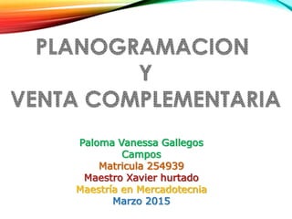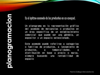 El documento habla sobre la planogramación, que es la representación gráfica del acomodo de productos en un área comercial como una góndola o exhibidor. Un planograma busca optimizar el espacio y rentabilidad colocando los productos de manera estratégica para impulsar ventas o destacar ofertas.