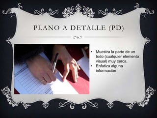 El documento describe diferentes tipos de planos cinematográficos, incluyendo el plano a detalle que muestra una parte cercana de un elemento visual, el primerísimo primer plano que corta la frente o el mentón de un personaje de forma íntima y asfixiante, y el plano medio corto que muestra de la cintura a la cabeza y se usa con frecuencia para la narrativa.