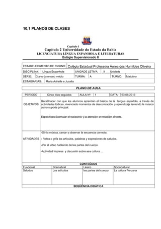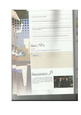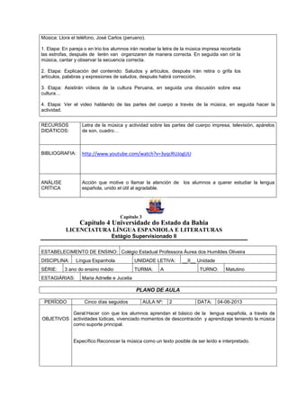 Este plan de clase de 5 días propone el uso de la música como herramienta principal para enseñar elementos básicos del idioma español a estudiantes de tercer año de secundaria de manera lúdica y entretenida. Cada día se enfoca en un tema gramatical como saludos, sustantivos, adjetivos o verbos y contiene actividades como escuchar canciones, completar letras, juegos y discusiones para practicar lo aprendido. El objetivo es motivar a los estudiantes a aprender español de una manera ag