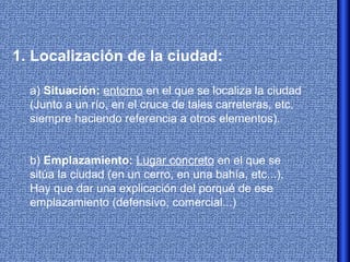 La ciudad se localiza junto a un río que le provee de agua. Está emplazada sobre un cerro en un meandro del río, lo que le proporciona una ventaja defensiva. La morfología urbana incluye varios tipos de trazados como ortogonal, irregular y lineal. El casco antiguo mantiene la estructura heredada de la época romana, mientras que el ensanche sigue un trazado de cuadrícula burgués y los barrios obreros se localizan en la periferia junto a las v