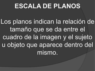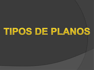 Este documento describe diferentes tipos de planos y ángulos utilizados en fotografía y cinematografía. Explica los planos panorámico, general, conjunto, entero, americano, medio, primer plano, primerísimo primer plano y detalle, así como los ángulos picado, normal y contrapicado. Cada plano y ángulo enfoca una parte diferente del sujeto u objeto y proporciona un contexto y nivel de detalle único.