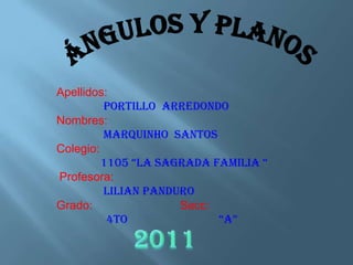 El documento proporciona información básica sobre un estudiante, incluyendo su nombre completo, el colegio al que asiste, el grado y la sección, y el nombre de su profesora.