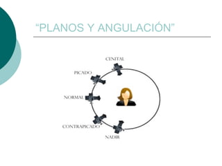 El documento describe los diferentes tipos de planos y ángulos de encuadre utilizados en fotografía y cinematografía, incluyendo planos generales, planos medios, primeros planos y planos de detalle, así como ángulos normales, picados, contrapicados, cenitales y nadir.