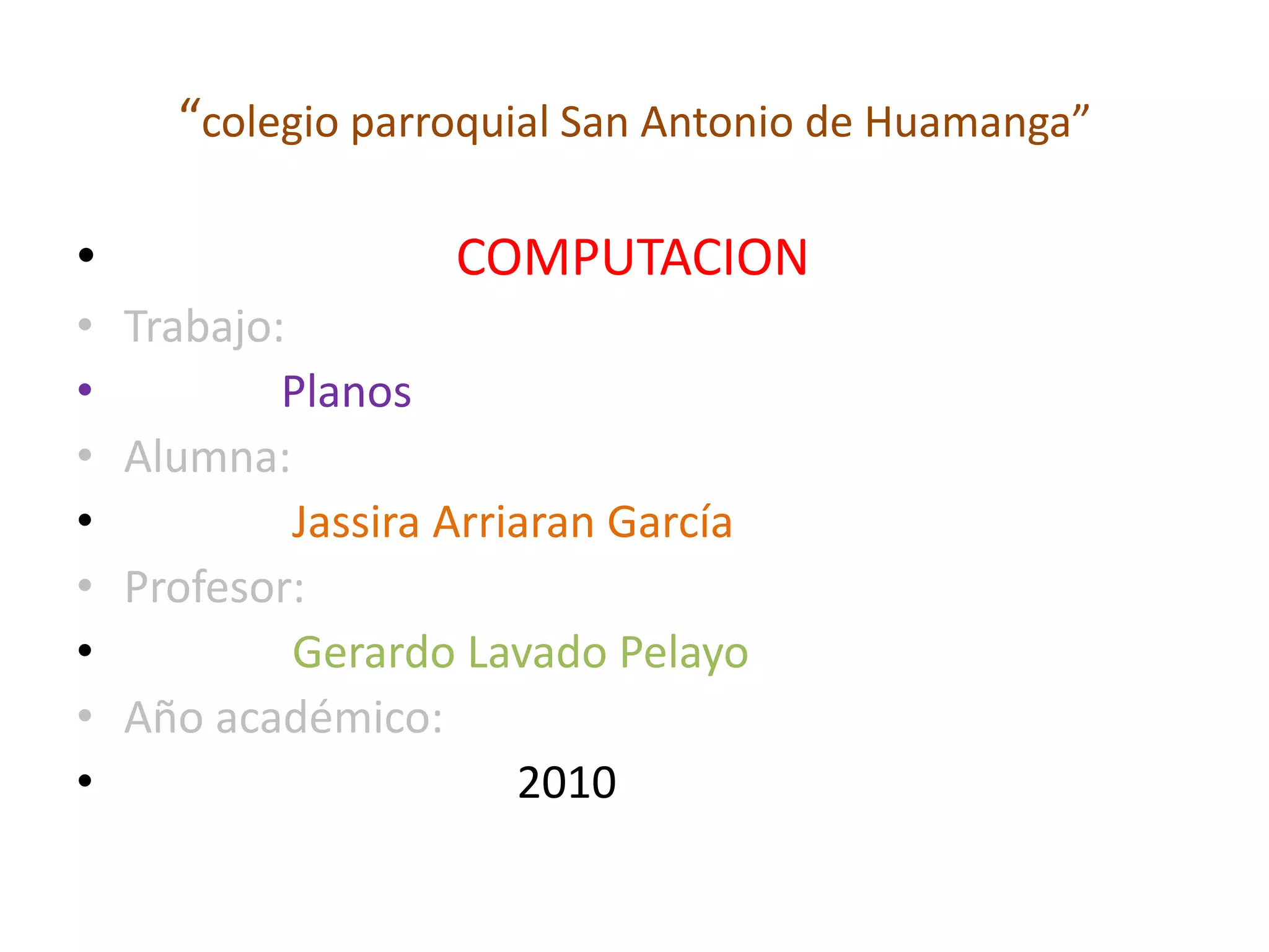 El plano muestra las habitaciones de un colegio parroquial, incluyendo un salón, oficina, sala y dormitorio. La alumna Jassira Arriaran García creó los planos bajo la supervisión del profesor Gerardo Lavado Pelayo durante el año académico 2010.
