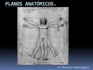 El documento describe los principales planos anatómicos y términos direccionales utilizados para describir la posición y relaciones de los tejidos y órganos del cuerpo humano. Explica los planos sagital, coronal y transversal que dividen el cuerpo, así como términos como anterior, posterior, superior e inferior. También define conceptos como aducción, abducción, flexión y extensión, y describe las principales cavidades del cuerpo como la craneal, torácica y pélvica.