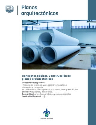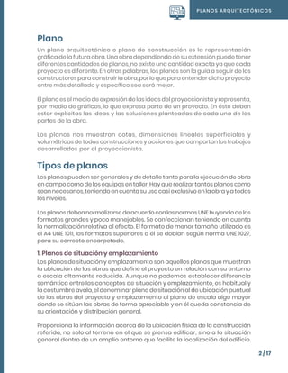 Este documento describe los diferentes tipos de planos arquitectónicos necesarios para la construcción de un edificio, incluyendo planos de situación, cimentación, cubierta, instalaciones, estructurales, alzados, secciones y detalles. Explica conceptos como escala, composición, margen y pie de plano, elementos fundamentales para la elaboración correcta de planos arquitectónicos.