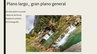 El documento describe diferentes tipos de planos, ángulos y luces utilizados en fotografía. Explica planos como plano largo, medio y corto, así como primer plano y detalle. Describe ángulos como normal, contrapicado y picado. Finalmente, detalla tipos de luces como natural, artificial, frontal, lateral y contraluz, así como la técnica de claroscuro.