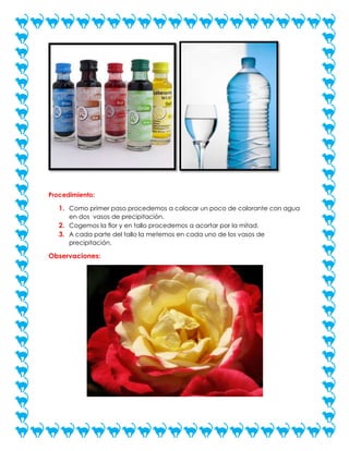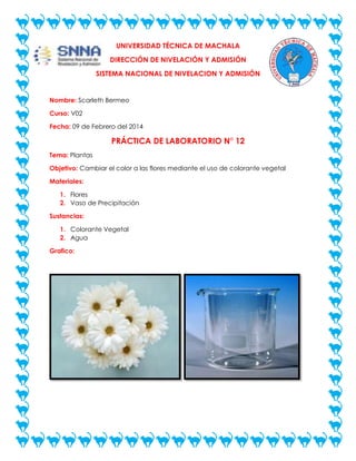 Este documento describe una práctica de laboratorio realizada por una estudiante llamada Scarleth Bermeo para cambiar el color de las flores usando colorante vegetal. El objetivo era acortar los tallos de las flores y colocarlos en vasos con agua y colorante para teñir las flores. Como conclusión, se logró obtener flores con más de un color usando los colorantes vegetales.