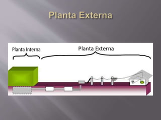 La planta externa en telecomunicaciones comprende la infraestructura que conecta la central telefónica con el usuario final, incluyendo cables, cajas de empalme, tendidos y equipos. Esta infraestructura incluye líneas de acometida desde cajas terminales hasta el punto de terminación de red del usuario, así como armarios de intemperie, cables y la central telefónica donde se encuentra el repartidor principal.