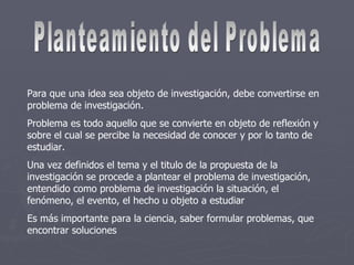 Para plantear un problema de investigación, debe expresar una relación entre variables y formularse como una pregunta clara y sin ambigüedades. Además, el problema debe permitir una prueba empírica. Al seleccionar un tema, se deben considerar factores como la carrera del investigador, el área de conocimiento y la asignatura a estudiar. Al plantear el problema, es importante definir los objetivos, formular preguntas de investigación y justificar por qué el estudio es necesario e importante.