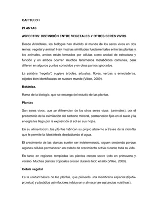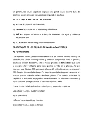 Este documento describe las características fundamentales de las plantas. Las plantas se diferencian de los animales en que permanecen fijas en el suelo, fabrican su propio alimento a través de la fotosíntesis, y suelen tener un crecimiento indeterminado. El documento también describe las estructuras y funciones básicas de las células y partes de las plantas, incluyendo la fotosíntesis, respiración, reproducción y clasificaciones de plantas.