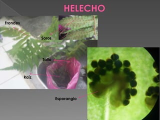 El documento describe las partes de una planta con flores, incluyendo la raíz, tallo, hojas, flores con pétalos, sépalos, pistilo con ovario, óvulos y estigma, y frutos con semillas.