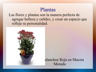 El documento destaca la importancia de las plantas en el hogar, resaltando su capacidad para embellecer espacios y purificar el aire. Se menciona cómo las plantas de interior, como el kalanchoe y la azalea, contribuyen a eliminar toxinas y mejorar la calidad del aire. Además, se enfatiza que crear un ambiente verde puede reflejar la personalidad del propietario.