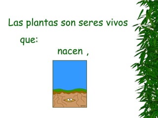 Las plantas son seres vivos que nacen, se alimentan, crecen, se reproducen y mueren, pero no se desplazan. Tienen partes como la raíz, el tallo, las hojas, las flores y los frutos, que cumplen funciones importantes como fijar la planta, absorber agua y nutrientes, transportar alimento, respirar y reproducirse. Las plantas pueden ser herbáceas o leñosas, y existen diferentes tipos de raíces, tallos, hojas, flores y frutos.